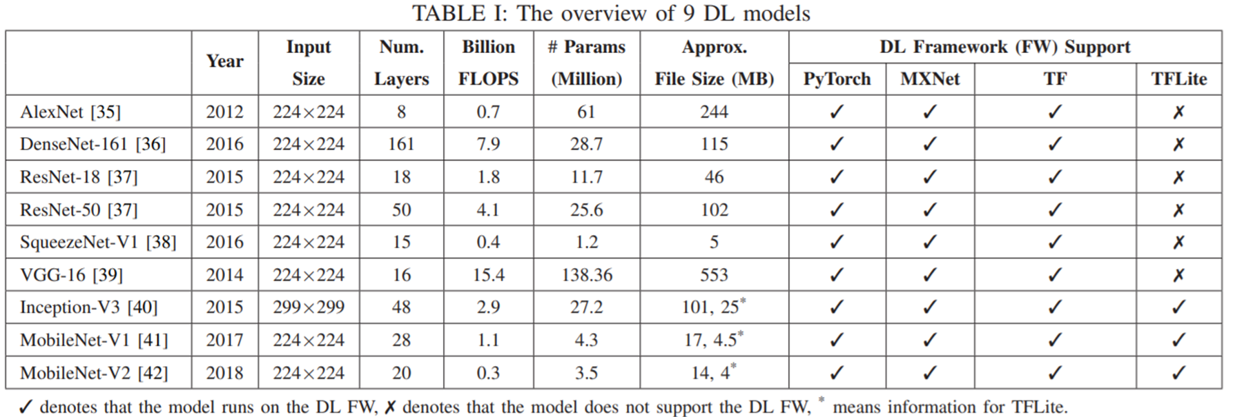 : 원래 실행할 모델의 복잡성과 Neural networks의 Layer의 수가 증가함에 따라 DL models의 연산 정확도와 size가 증가하지만 위의 실험에서는 Edge device 환경에서의 Resource constrained 를 적용하기 위하여 많은 DL models 중 9 개의 pre trained DL models를 채택하였습니다. (채택한 아홉 개의 모델들은 Edge device에서의 Image classification 추론을 시뮬레이션 하기에 적합한 모델 사이즈를 갖고 있음)