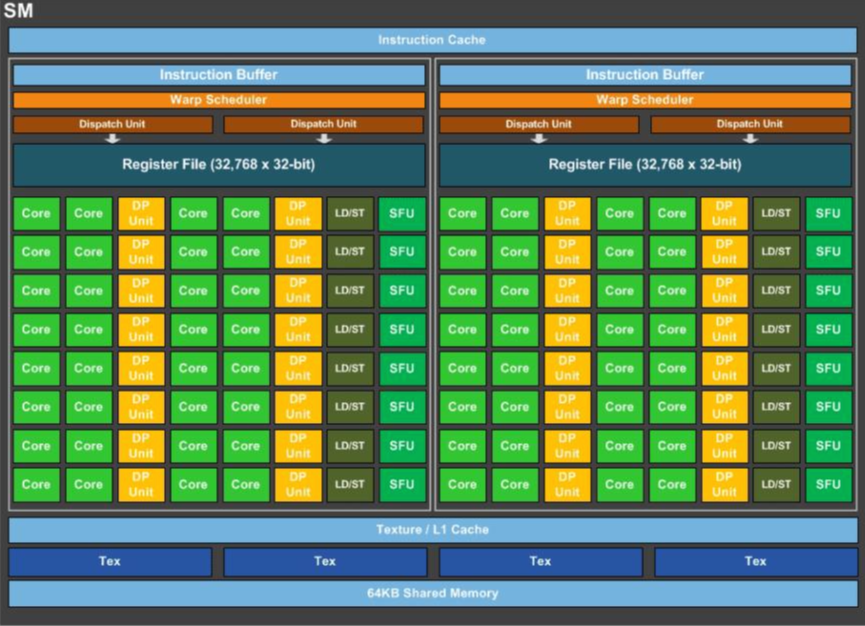 Core(이전 Architecture에서는 SP 개념)의 수가 증가했다는 것은 GPU 내부적으로 더 많은 명령어들을 빠르게 공급해야할 필요가 생겼다는 것을 의미합니다. 따라서 *Warp Scheduler가 2개로 증가했으며 각 Warp Scheduler는 독립적으로 Dispatch Unit을 통해 명령어를 보낼 수 있습니다. 이론적으로 Dispatch Unit이 2개 이기 때문에 한 SM 내에서 2개의 명령어가 독립적으로 실행될 수 있지만 특별한 경우에 한해서는 하나의 SM 내에서 하나의 명령어만 처리하게 됩니다. (특별한 경우라 함은 1. 두 Warp Scheduler에서 사용하려는 실행 유닛 그룹이 겹치는 경우 2. 64Bit 부동소수점 연산을 사용하는 경우)
