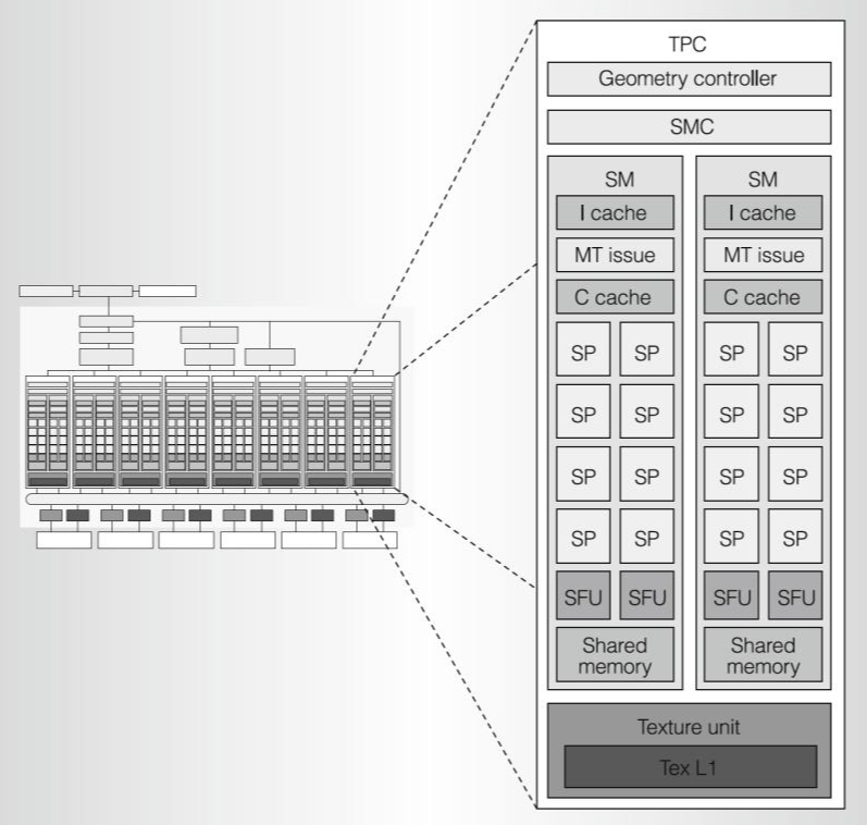 하나의 Streaming Multiprocessor는 8개의 SP(Streaming processor)와 2개의 SFU(Special-Function units)로 이루어져있습니다. 추가적으로 하나의 MT issue(Multithreaded Instruction fetch and issue unit) 공간과 instruction cache, Read만 가능한 Constant cache, 16KByte 크기의 Read/Write shared memory가 존재합니다. 그림에 보이는 SM 하단의 Texture unit은 SM과 외부 메모리 간의 Load/Store 명령어 수행 시에 사용됩니다.