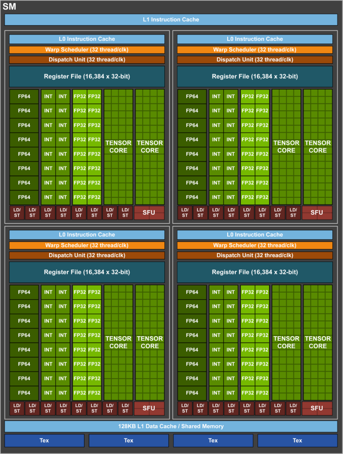 아래의 그림은 Volta architecture의 SM 구조를 나타내고 있습니다. 새로운 Architecture에서 Chip당 84개의 SM이 포함되어 있습니다. 기존의 CUDA Cores의 경우 FP32 Cores로 이름이 변했고 기존 Architecture에서 가장 많은 부분을 차지했던 FP32 Core와 동일한 수의 정수 연산 Cores(INT Core)가 추가되었는데 이는 DL 연산의 가속을 위한 요소입니다. FP64 Cores의 경우 Pascal Architecture와 동일한 비율로 FP32 Cores의 절반이 탑재되었으며 Warp Scheduler마다 2개의 Tensor Core가 짝을 이루고 있음을 확인할 수 있습니다. 추가적으로 전에 없던 L0 Cache가 추가되었음을 확인할 수 있습니다.
