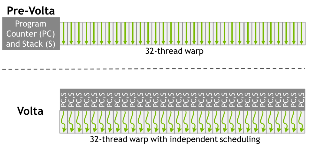 추가적으로 Pascal Architecture 까지는 하나의 Warp를 이루고 있는 32개의 Thread는 반드시 동시에 진행을 했지만 Volta Architecture의 경우 아래 그림과 같이 하나의 Warp 내에서 32개의 Thread 각각이 독립적인 PC(Program Counter)를 갖고 독립적으로 진행하는 것이 가능해졌습니다. 이는 원래 Warp scheduler와 짝을 이루던 Dispatch unit의 수가 변한 이유중 하나로 판단됩니다. 위와 같은 변화가 생겼던 이유는 실행 유닛의 종류가 다양해지면서 (FP16, FP32, FP64, INT Core, LD&ST, Tensor Core, SFU) 각 실행 유닛 별 Latancy 차이로 발생하는 비효율을 피하기 위한 조치라 판단됩니다.
