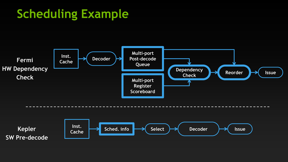 Fermi Architecture의 경우 CUDA Core, LD/ST unit, SFU 내부의 파이프라인 상에서 진행중인 명령어들의 수행이 완료되었는지 확인하는 Scoreboard 회로와 이를 바탕으로 다음에 실행될 명령어 사이의 Dependency를 동적으로 확인하는 Dependency Check 회로가 존재했습니다. 이는 명령어들이 파이프라인 상에서 진행될 때 명령어 사이의 Dependency 때문에 Data hazard가 발생하는 상황을 예방하기 위한 회로입니다. 하지만 Kepler Architecture에서는 한 번에 처리하는 명령어가 4개에서 8개로 늘어나고 실행 유닛 그룹의 갯수 또한 크게 증가했기 때문에 위의 조건을 모두 고려해 회로를 설계한다면 Scheduling 회로의 복잡성이 너무 증가하게 됩니다. 하여 Kepler에서는 Compiler에 미리 명령어 실행을 완료하기 위한 필요 Cycle 수를 명령어와 함께 사용하여 다음에 실행할 명령어를 선택함으로써 Scoreboard와 Dependency check 회로 없이 간단한 방법으로 Scheduling을 구현할 수 있었습니다.