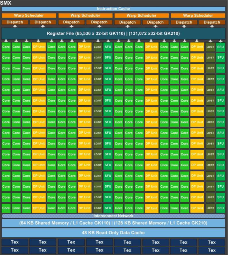 위의 그림은 Kepler Architecture의 Streaming Multiprocessor(SM)의 구조를 나타냅니다. Kepler Architecture부터 SM이 SMX라는 이름으로 변경되었으며 2배의 클럭 속도를 사용하지 않고 성능을 향상시키기 위하여 훨씬 많은 실행 유닛들을 도입했음을 확인할 수 있습니다. Kepler의 SMX에서는 192개의 CUDA Cores, 64개의 *64-Bit DP units, 32개의 LD&ST units, 32개의 SFU로 구성되어 있습니다. 늘어난 실행 유닛을 효과적으로 사용하기 위하여 Warp Scheduler의 갯수도 2개에서 4개로 증가했으며 각 Warp Scheduler unit에 대응되는 Dipatch unit 또한 1개에서 2개로 증가해 SMX에서는 동시에 최대 8개의 명령어를 처리하는 것이 가능해졌습니다. 또한 Register file 크기도 최대 128KB로 4배 가량 증가했으며 L1 Cache의 크기 또한 128KB로 Fermi SM의 2배가 되었음을 알 수 있습니다. 추가적으로 하나의 Thread가 사용할 수 있는 최대 Register의 수가 63개에서 255개로 늘어났는데 이는 DP unit의 갯수가 증가한 것과 더불어 그래픽 연산보다 High Performance Computing(HPC) 응용 분야의 성능 향상을 위한 변화라고 판단됩니다.