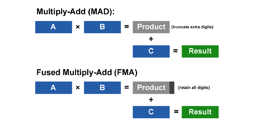위의 그림은 Fermi Architecture에서 적용된 부동소수점 연산인 FMA(Fused Multiply-Add)를 설명하는 그림입니다. 이 연산 방법의 적용으로 부동소수점 연산의 정확도 향상을 성취할 수 있었습니다. 위 그림을 통해 MAD 연산과 FMA 연산의 차이를 확인할 수 있는데 MAD의 경우 중간 계산 결과의 하위 Bits를 버린 다음 최종 결과를 계산하는 반면, FMA 에서는 중간 결과의 모든 하위 Bits를 보존한 상태로 최종 결과를 계산합니다. 기존의 MAD 연산은 계산 결과가 FMA에 비해 부정확하여 그래픽 연산에는 문제가 없었지만 General purpose computing에는 적합하지 않았습니다. 하지만 Fermi Architecture에서 FMA 연산이 지원되며 GPGPU Computing에 대한 지원이 강화되었습니다.