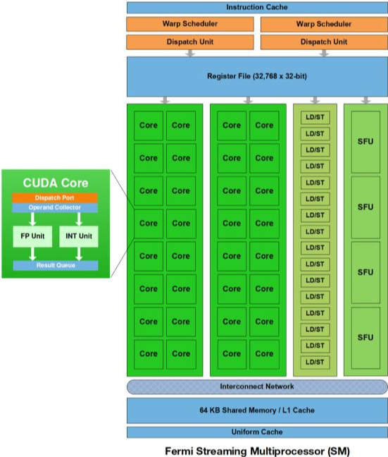 위의 그림은 Fermi Architecture의 SM 구조를 보여주는 그림으로 원래 SP(Streaming Processor)라 표기되었던 부분이 CUDA Core라는 이름으로 변경되고 그 수도 8개에서 32개로 증가했습니다. 한 SM 내에서 32개의 CUDA Core는 각 16개씩 2개의 그룹으로 나눠져있으며 LD/ST 1그룹과 SFU 1그룹을 포함해 총 4개의 그룹으로 나누어져 있습니다. 또한 Tesl Architecture에서는 하나의 SP 내부에 분산되어 존재하던 Register file들을 모아 밖으로 모아 CUDA Core 외부에 공간을 할당하여 배치하였으며 이를 통해 Register를 보다 효율적으로 사용할 수 있습니다.