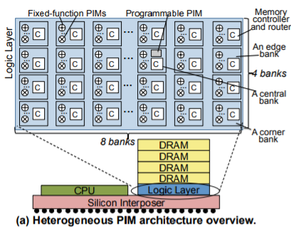 PIM의 H/W 모델에는 기본적으로 Heterogeneous PIM Architecture 구현을 위한 Logic layer가 존재합니다. 이 Logic layer는 3D die-stacked momory 구조로 설계되었으며 그 위에 수백개의 Fix-function을 위한 arithmetic units과 프로그래밍이 가능한 ARM based cores가 존재합니다. 3D die-stacked memory 구조란 평평한 Silicon 위에 연산을 위한 Logic layer을 쌓고 그 위에 DRAM을 순차적으로 올려 쌓는 구조를 의미합니다. (앞서 설명했듯이 Logic layer에는 Fixed-function cores와 Programmable cores가 존재합니다.) 또한 같은 Silicon 위에 CPU가 존재하기 때문에 Heterogeneous PIM Architecture라고 이름을 명명하였습니다.